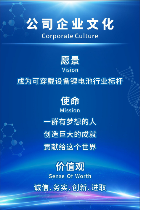 愿景: 成為可穿戴設(shè)備鋰電池行業(yè)標(biāo)桿