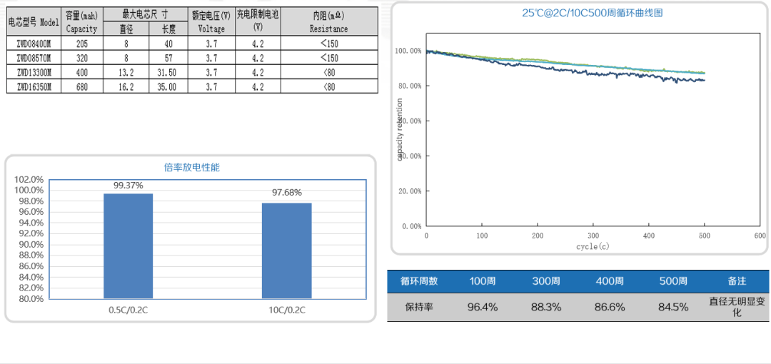 眾旺德開發(fā)的高倍率電池能夠滿足10C電流放電,應(yīng)用于電子煙等領(lǐng)域。電池的循環(huán)壽命可達(dá)500周。